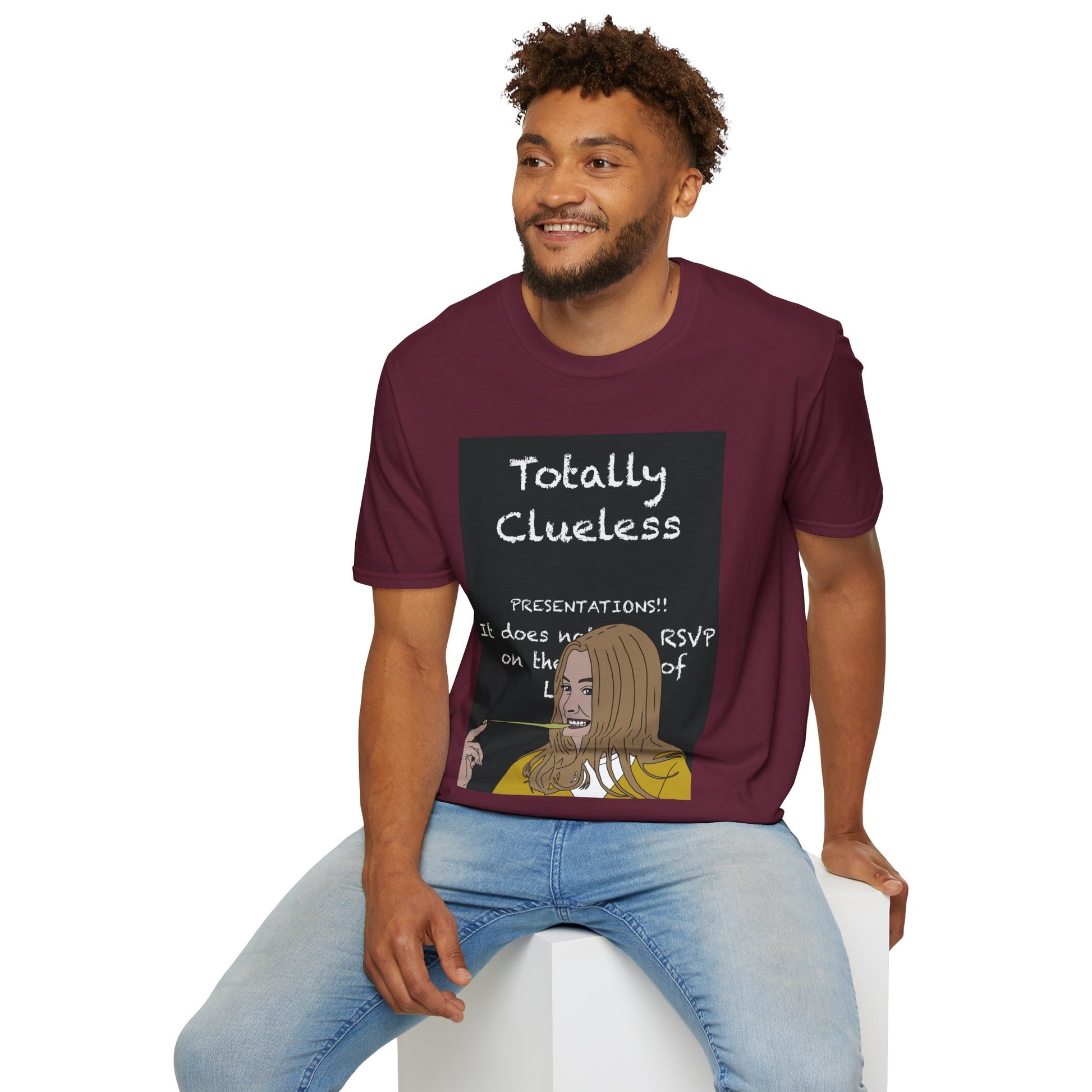 A light, soft tee that carries a wink and a grin. This shirt shows a hand-drawn scene of a frustrated presenter in front of a chalkboard that reads “Totally Clueless,” capturing that awkward, laughable moment we’ve all survived. Wear it to diffuse tension in casual meetings, to spark smiles at study sessions, or to bring levity to low-key gatherings. The breathable ring-spun cotton feels gentle on the skin while the clean crew neckline keeps the look simple and easy to layer. Subtle black flecks appear on Natural-colored shirts from the unprocessed cotton for an authentic, lived-in look.