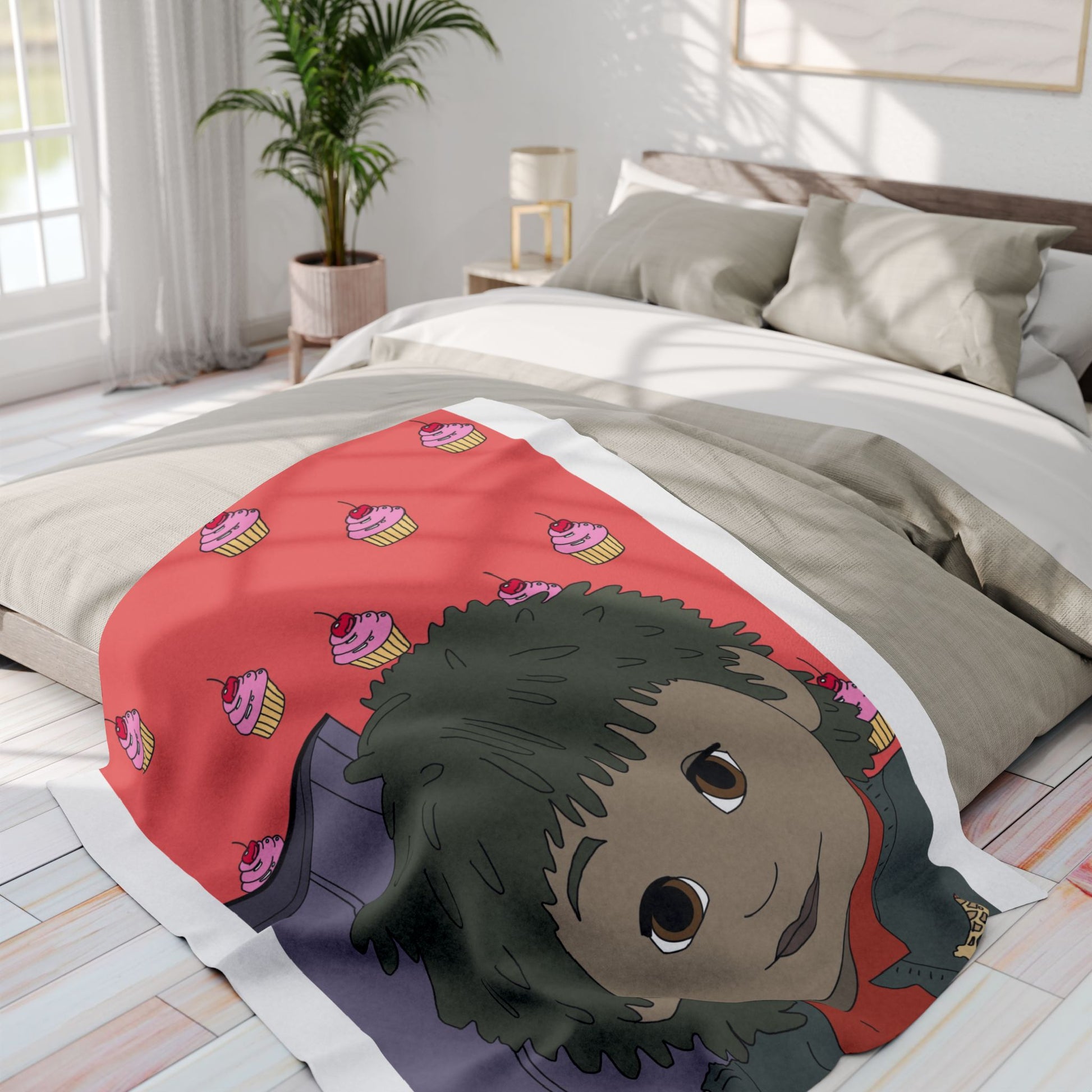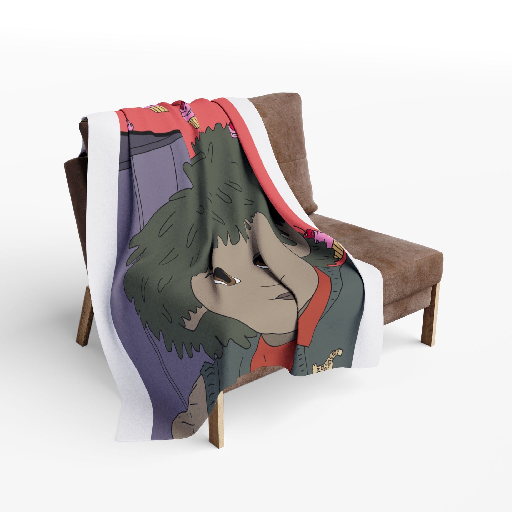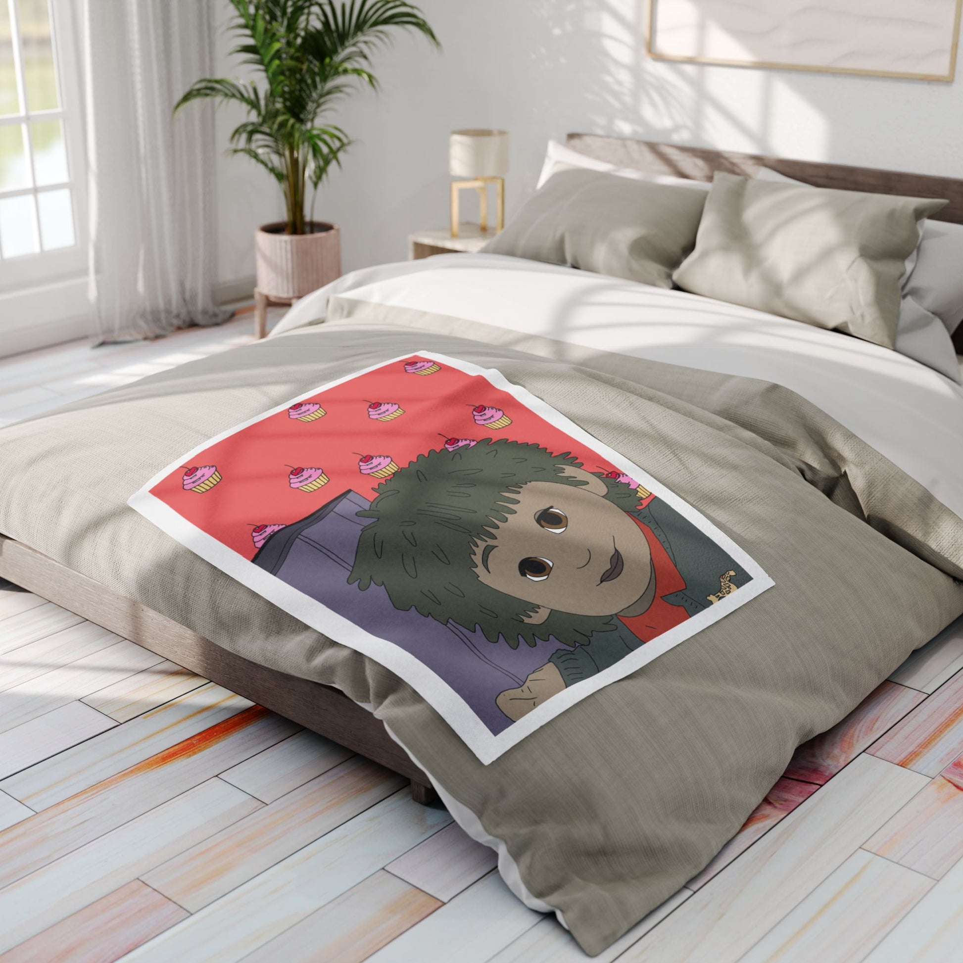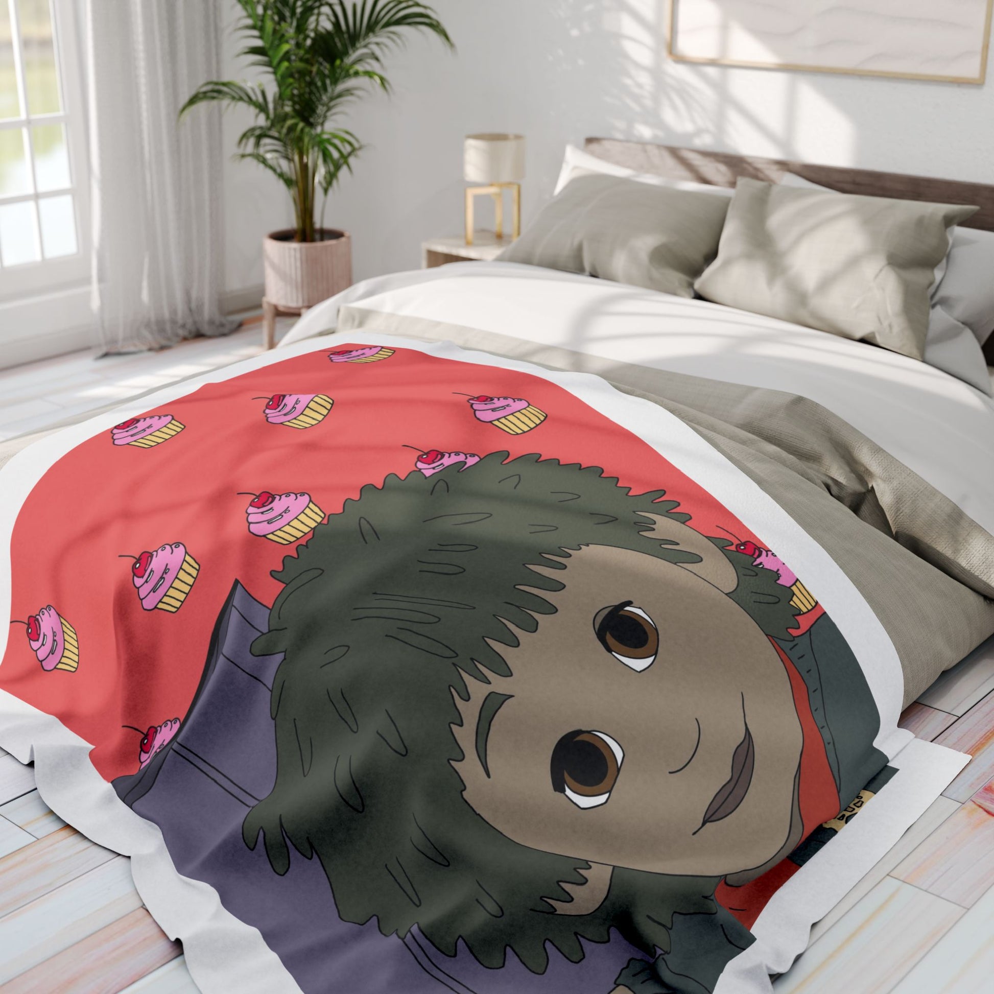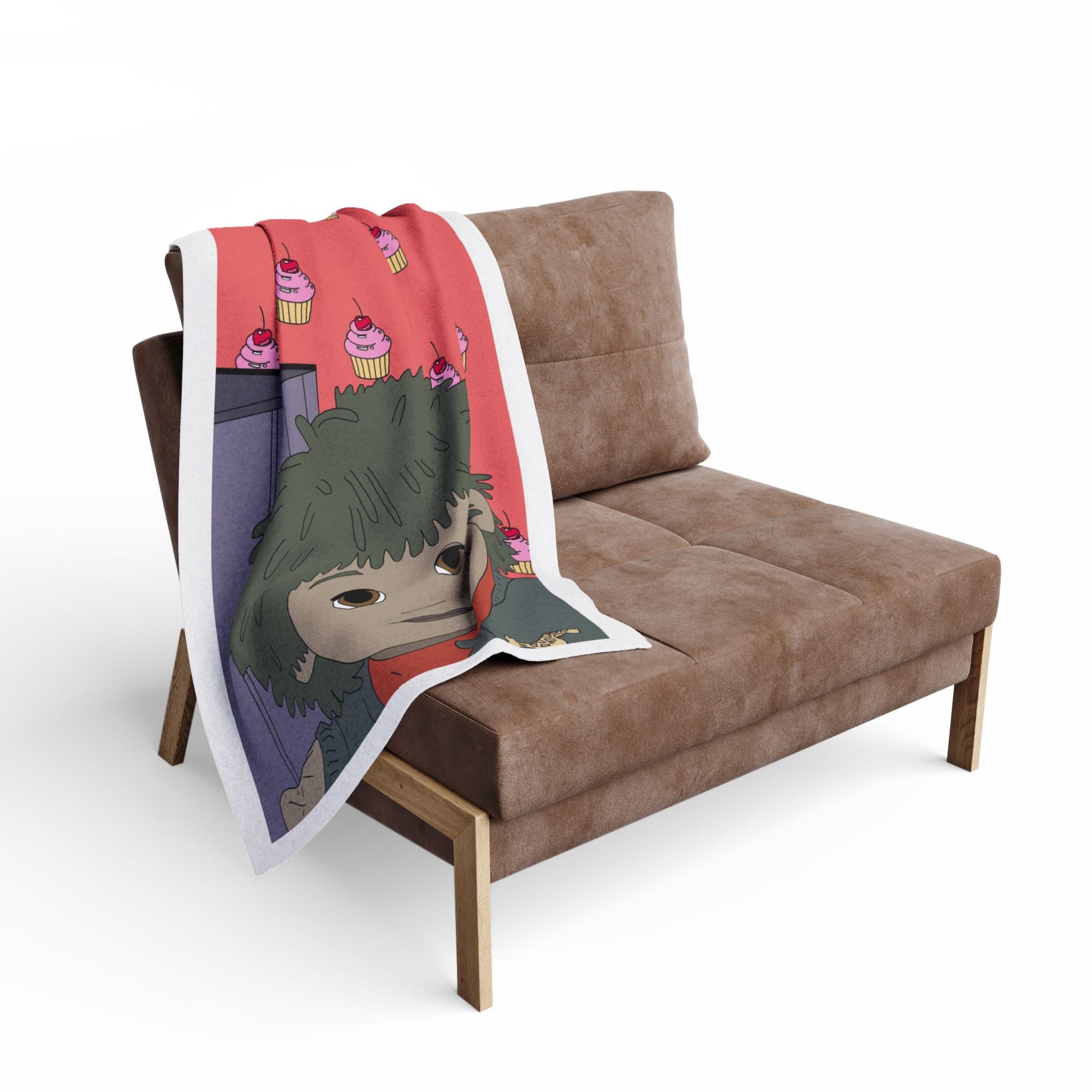 Bring a little warm, whimsical calm to quiet nights with this plush fleece blanket. Soft, thick polyester fleece cradles you as you sink into cozy stillness. The design shows a gentle, wide-eyed character against a playful pink cupcake background — a strange, comforting mix of nostalgia and cheeky charm. Drape it over a couch during a movie night, wrap up with it for late-night sketching or journaling, or let it add a cozy pop of personality to a studio corner. The vivid print stays bright through everyday use, and the hemmed edges keep the blanket looking neat and lived-in for seasons to come. This blanket feels like an easy companion for those who love quirky art, quiet evenings, and a touch of handmade-style warmth.