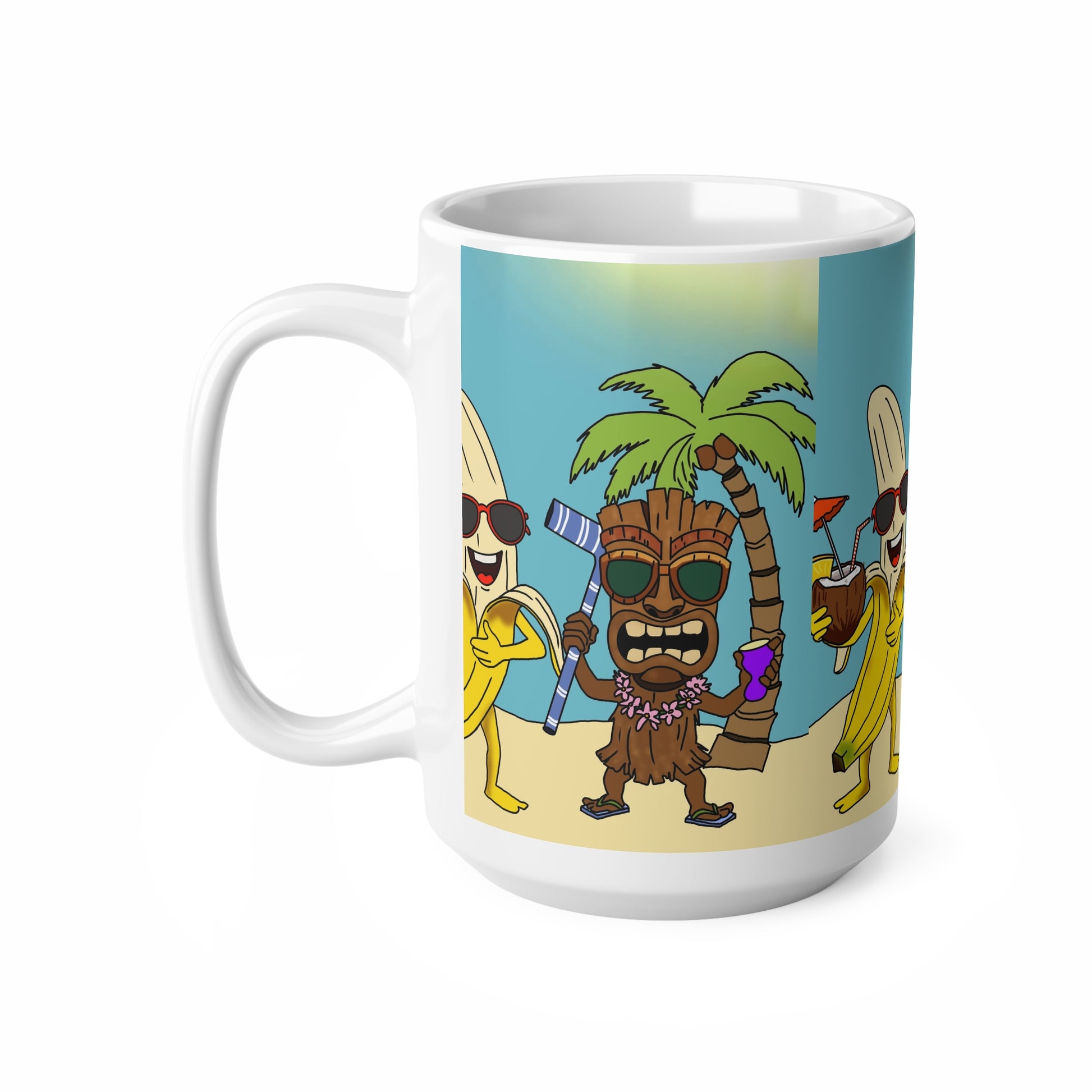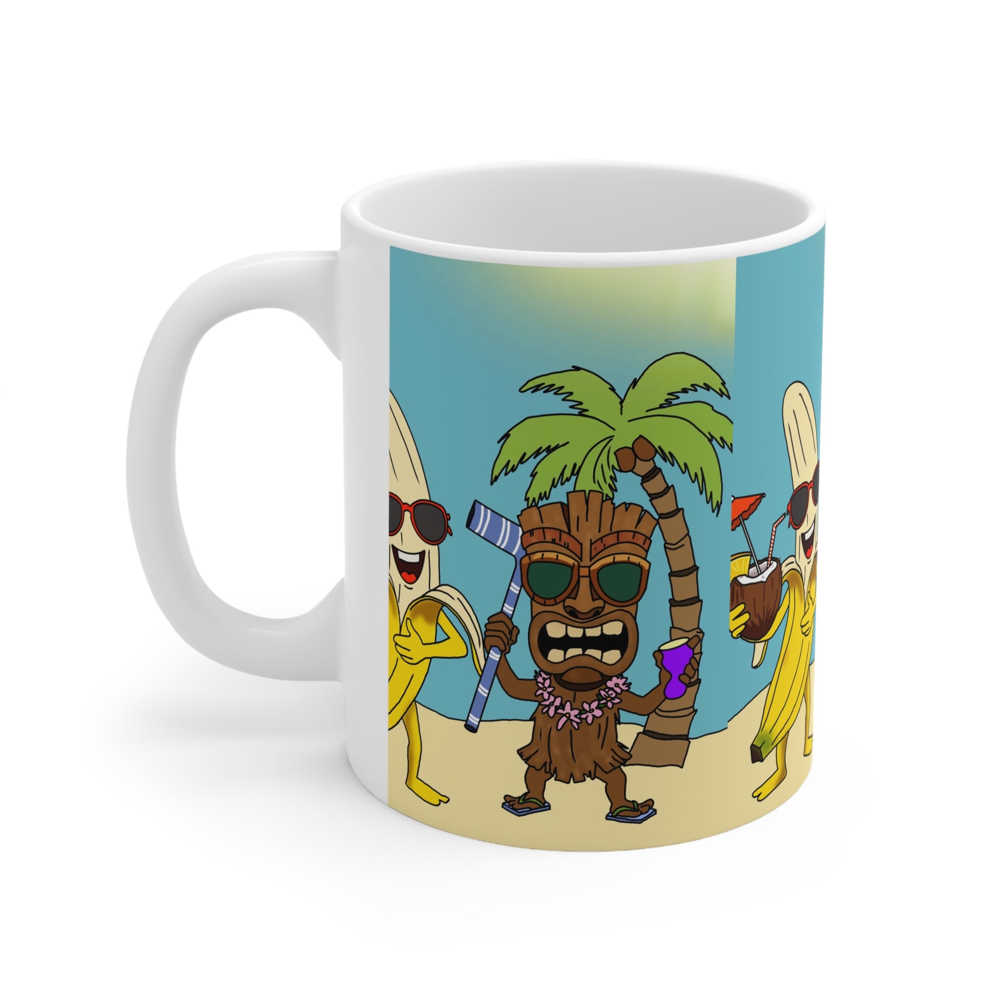 Bright, sunny energy wrapped in a ceramic cup. This glossy mug features playful tropical characters — a sunglasses-wearing banana and a tiki friend sharing drinks beneath palm trees — rendered in vivid, crisp color that pops against a soft sky-blue background. It’s the kind of mug that brings a small vacation to your morning routine: warm sunlight, a salty breeze, and a silly grin with every sip. Hold it by the comfortable C-handle and let the cheerful scene lift your mood during slow weekend coffee, beach-house mornings, or when you need a little island spirit at your desk.