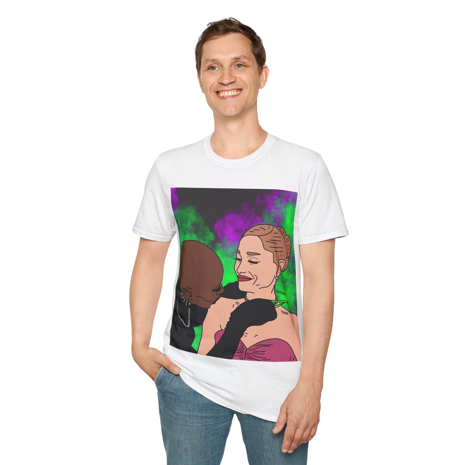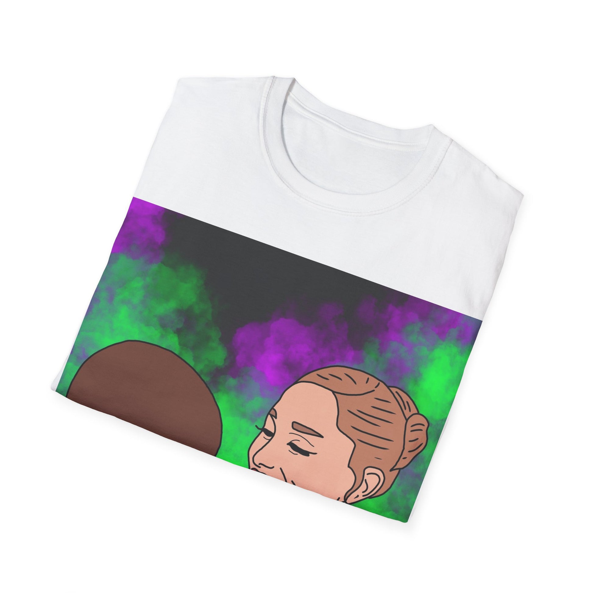 This lightweight cotton tee carries an evocative, cinematic illustration that feels equal parts intimate and surreal. The design shows two figures in a close, intense moment against a swirling backdrop of neon greens and purples — a shirt that reads like a short story you can wear. The soft ring-spun fabric sits gently on the skin; the classic crew cut and clean lines keep the art front-and-center. Wear it when you want your outfit to start conversations, anchor an outfit for late-night shows, or stir memories of dramatic evenings with friends.