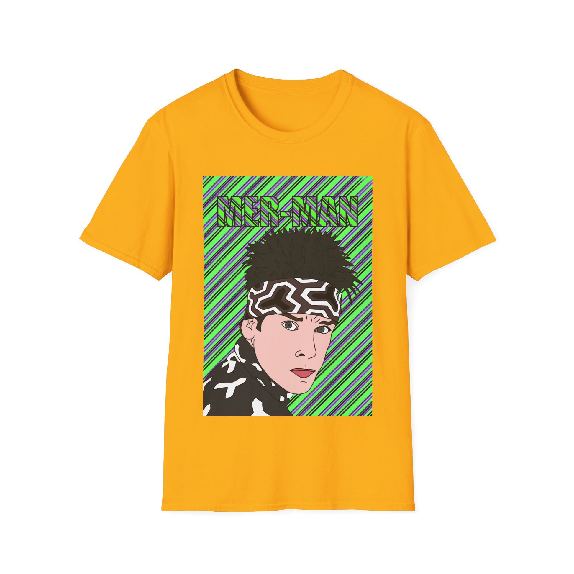 A crisp, lightweight tee that feels like your go-to from the first wear. The front features a bold pop-art portrait with neon-green diagonal stripes and a stylized bandana — an edgy, street-inspired look that stands out without shouting. The crew neckline and classic fit keep the silhouette familiar and wearable; the soft ring-spun cotton drapes cleanly while the tubular knit means fewer seams and a smooth profile. Wear it layered under a jacket for nights out or solo on sunlit afternoons — it moves easily from skate sessions to coffee shop hangs, carrying a confident, urban energy.